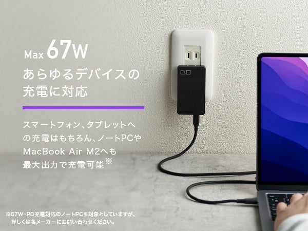 ◆67W高出力でノートPCなど、あらゆるデバイスを充電可能。