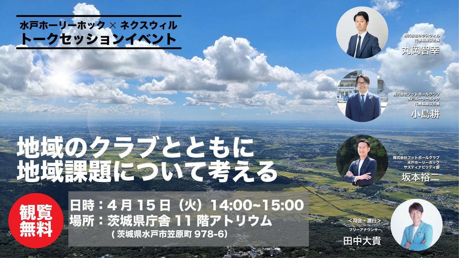 このたび水戸ホーリーホックは、4月15日(火)茨城県庁舎11階アトリウムにて、株式会社ネクスウィルとともにトークセッションイベント「地域のクラブとともに地域課題について考える」を開催いたします。