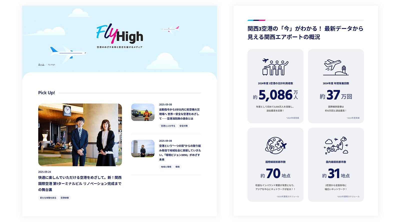 また、今回のリニューアルに合わせ、関西エアポートグループで働く社員やプロジェクトなどにフォーカスしたオウンドメディア「Fly High」も新たにスタートします。