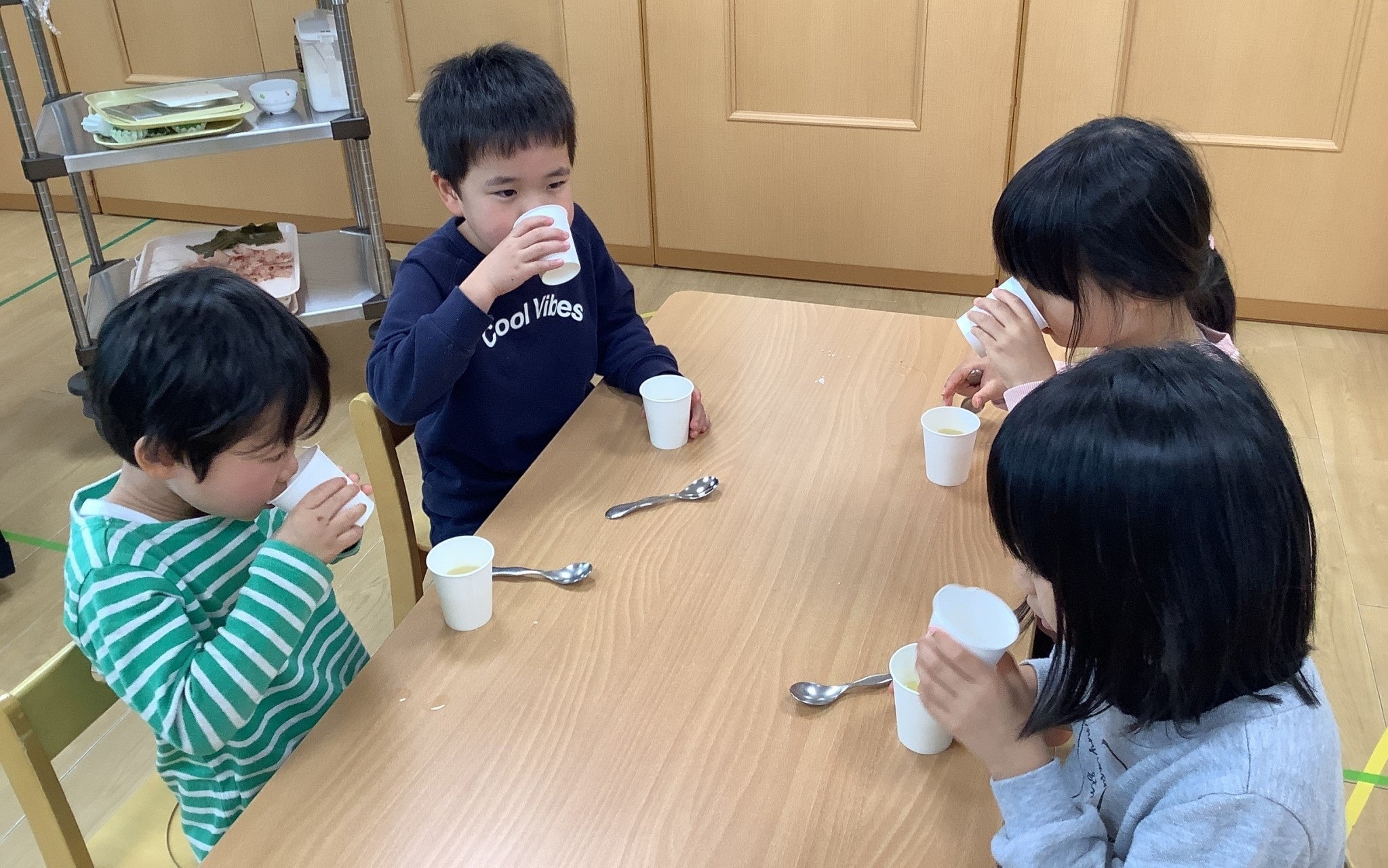 離乳食体験をきっかけに、味に興味を持った子どもたち。おいしい味とはどんなことかを知ってもらうため、だしや調味料を食材に混ぜて味の違いを体験しました。ココアだけだと苦いけど、そこに砂糖を混ぜると甘くておいしい、レモンだけだとすっぱいけど、砂糖とお水を混ぜるとジュースみたいで甘くておいしい、昆布だしやかつおだしに塩を混ぜるとおいしい、などを体験。また味が変わることで、嫌いな食べ物もおいしく食べられることに気が付きました。