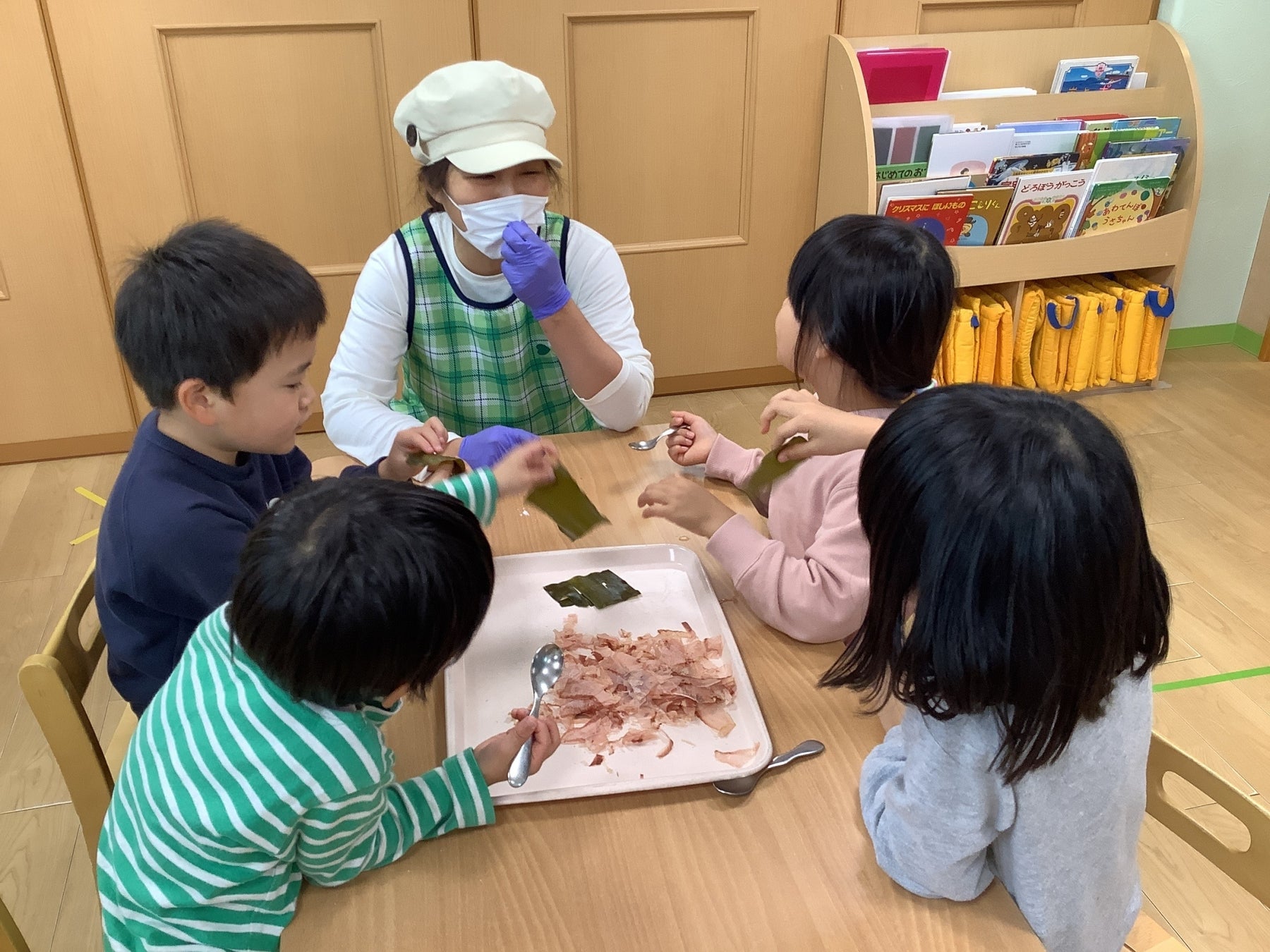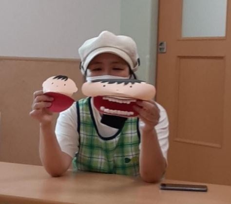 離乳食体験をきっかけに、赤ちゃんには歯が無く、成長したら歯がそろうことを知りました。歯が抜け変わる時期にもなり、子どもたちが体の成長に興味を持ち始めるようになってきたので、噛むことや歯の大切さについて知ってもらいました。子どもたちは、お米を30回噛んだ時の味の変化や、おしゃぶり昆布をしっかり噛んで食べた時の感覚を体験しました。