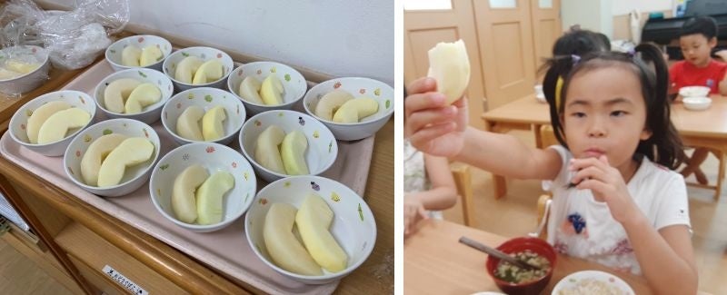 離乳食体験から、子どもたちは食材その物の味があることを知りました。そこで「りんご」と「なし」という見た目が似た果物の違いを知る体験を実施。最初は区別がつかない子も多くいましたが、同時に食べて味やにおい、食感の違いを体験し、違いを知ってもらいました。なしはシャキシャキしていて水分がいっぱい、りんごはサクサクしていて黄色いなど、子どもたちは比べることで違いを実感していました。