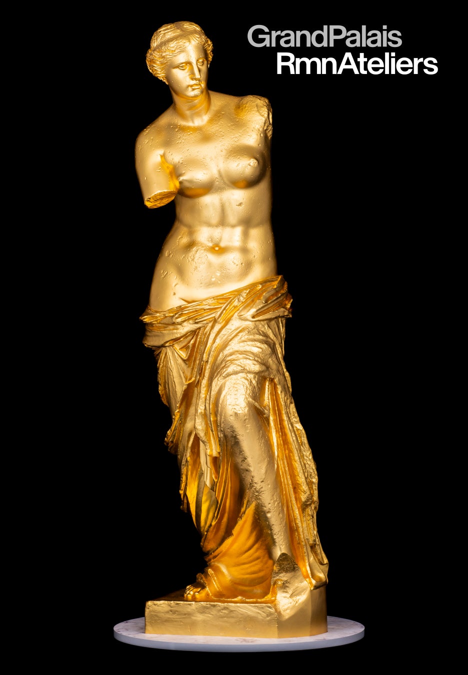 パリのルーブル美術館に展示されている、ミロのヴィーナス像をGrandPalaisフランス国立美術館連合の芸術工房(ムラージュ工房)協力のもと、忠実に再現された黄金の等身大「ミロのヴィーナス」。