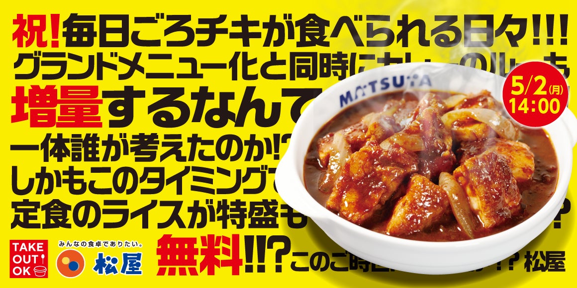 【松屋】特報!大人気“ごろチキ”が定番メニューにグランドメニュー刷新のお知らせ