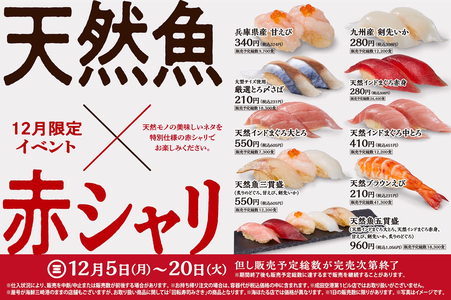 株式会社 京樽(本社:東京都中央区、代表取締役社長:堀江 陽)が展開する「回転寿司みさき(旧:海鮮三崎港)」では、12月5日(月)より12月限定イベントとして『天然魚×赤シャリフェア』を開催いたします。