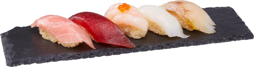 赤シャリと合う天然魚としてご用意した“天然インドまぐろ”は、旨みが強くどっしりとした濃い味わいが特長で、上質な脂の旨みを存分にお楽しみいただける「大とろ」、赤身と脂のバランスが抜群の「中とろ」、濃厚なまぐろの旨みを堪能できる「赤身」の3種類をご提供いたします。その他にも、手作業でスピーディーに殻を剥き鮮度を保ったまま凍結することで、プリっとした食感が楽しめる「兵庫県産 甘えび」、鮮度抜群の剣先いかをそのまま凍結することで、ねっとりとした舌ざわりが楽しめる「九州産 剣先いか」、脂ののった大型サイズの真さばを、ほどよく酢で〆ることで旨みを引き出した「厳選とろ〆さば」、食べ応えのある「天然ブラウンえび」、香ばしく炙ったのどぐろをはじめとする5種の天然魚を満喫できる「天然魚五貫盛」が期間限定で登場します。