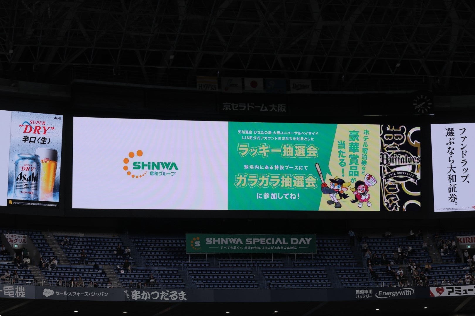 5月9日(金)に京セラドーム大阪で開催されたオリックス主催公式戦「オリックスvsソフトバンク」では、「SHINWA SPECIAL DAY」と題し、会場内の様々な看板・ビジョン等で信和グループの紹介が行われました。