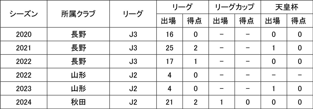 前所属/鳥山北FC – FCトッカーノU-15 – 市立船橋高校 – 新潟医療福祉大学 – AC長野パルセイロ – モンテディオ山形 – ブラウブリッツ秋田