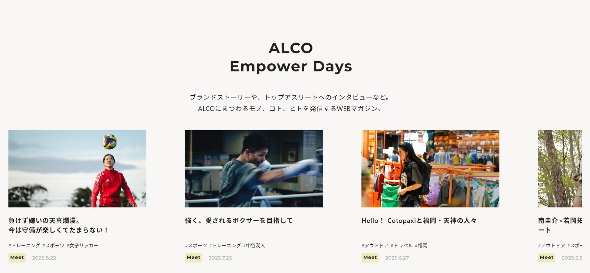 当社が運営するオウンドメディア「ALCO Empower Days」を通して、皆様に単なる情報以上の「気づき」や「共感」を提供したいと考えています。最前線で活躍するアスリートの哲学や、新しいカルチャーが生まれる瞬間の熱量をより多くの人たちと共有するため、ALCOの活動や、プロジェクトを伝えるWEBメディアへとして再構築いたします