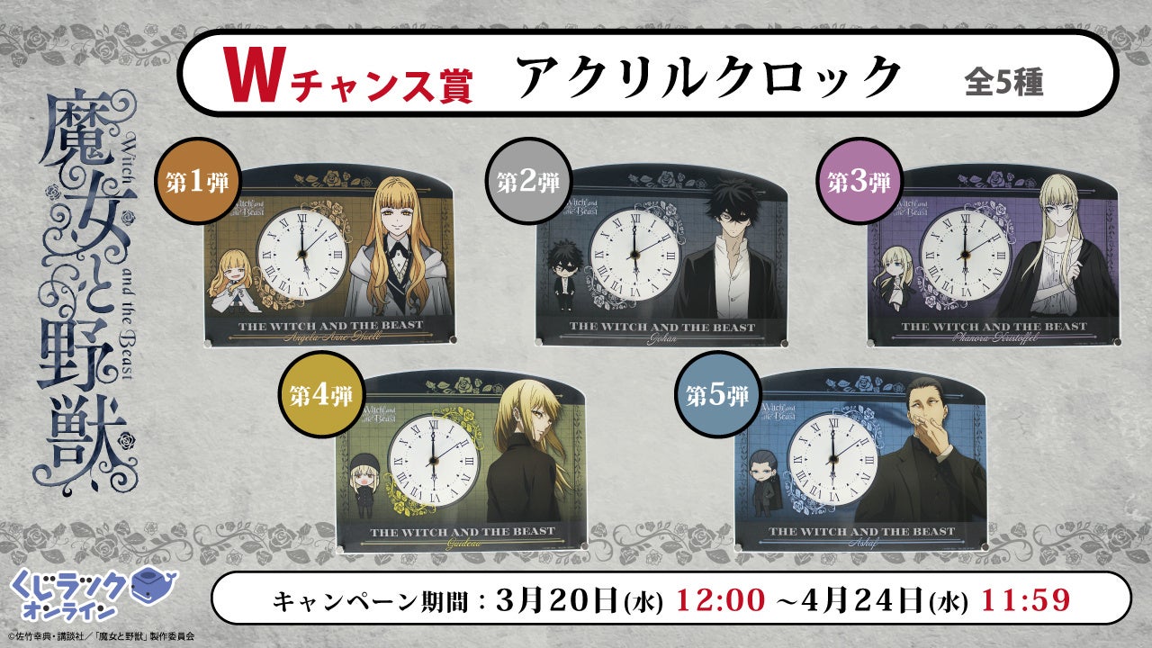 カルチュア・エンタテインメント株式会社(以下、CE)は、佐竹幸典原作、TVアニメ「魔女と野獣」(講談社刊)とコラボレーションした、ハズレ無しでキャラクターグッズがゲットできるオンラインくじ「くじラックオンライン」を2024年3月20日(水)より発売いたします。賞品はA賞~E賞まで5アイテム(全32種)となっております。さらに、くじ1枚ご購入ごとにWチャンス賞の抽選が行われ、当選した方は特別な賞品が獲得できます。