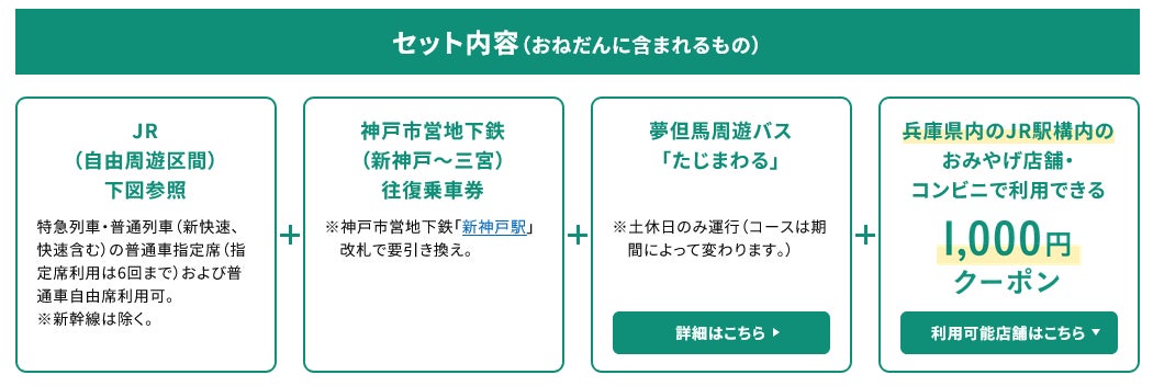 兵庫県内JR乗り放題+人気ホテル宿泊の嬉しいセットプラン!夢但馬周遊バス「たじまわる」で観光地巡りをお楽しみいただけます。兵庫県内のJR駅構内のおみやげ店舗・コンビニで利用できる1,000円クーポン付