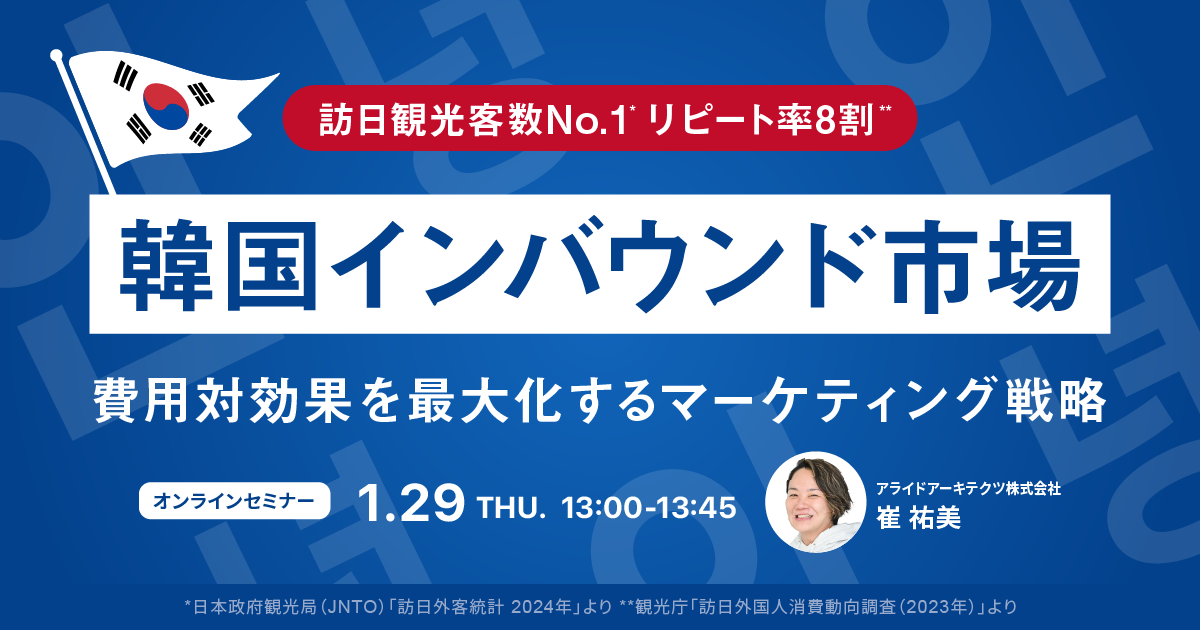 データとクリエイティブの力でマーケティングコミュニケーションを設計し、企業のマーケティングAXを支援するアライドアーキテクツ株式会社(本社:東京都渋谷区、取締役社長:村岡弥真人、証券コード:6081、以下「当社」)は、1月29日(木)に無料オンラインセミナー「韓国インバウンド市場を徹底解説!費用対効果を最大化するマーケティング戦略」を開催いたします。
