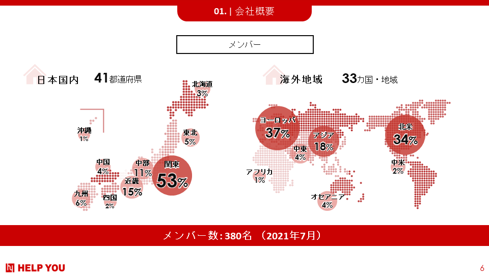 現在、日本全国・世界33カ国の約400人の当社メンバーがフルリモートで自分らしい生き方・働き方を実践しながら顧客への提供価値を上げ続けています。メンバーはアメリカ・フランス・ドイツなど世界33カ国に、東京都、宮城県、大阪府、福岡県など全国各地にいます。