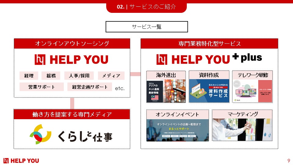 事業内容 :オンラインアウトソーシングサービス「HELP YOU(ヘルプユー)」の運営。働き手への学びのサービス、働き手を応援するメディア事業なども展開。