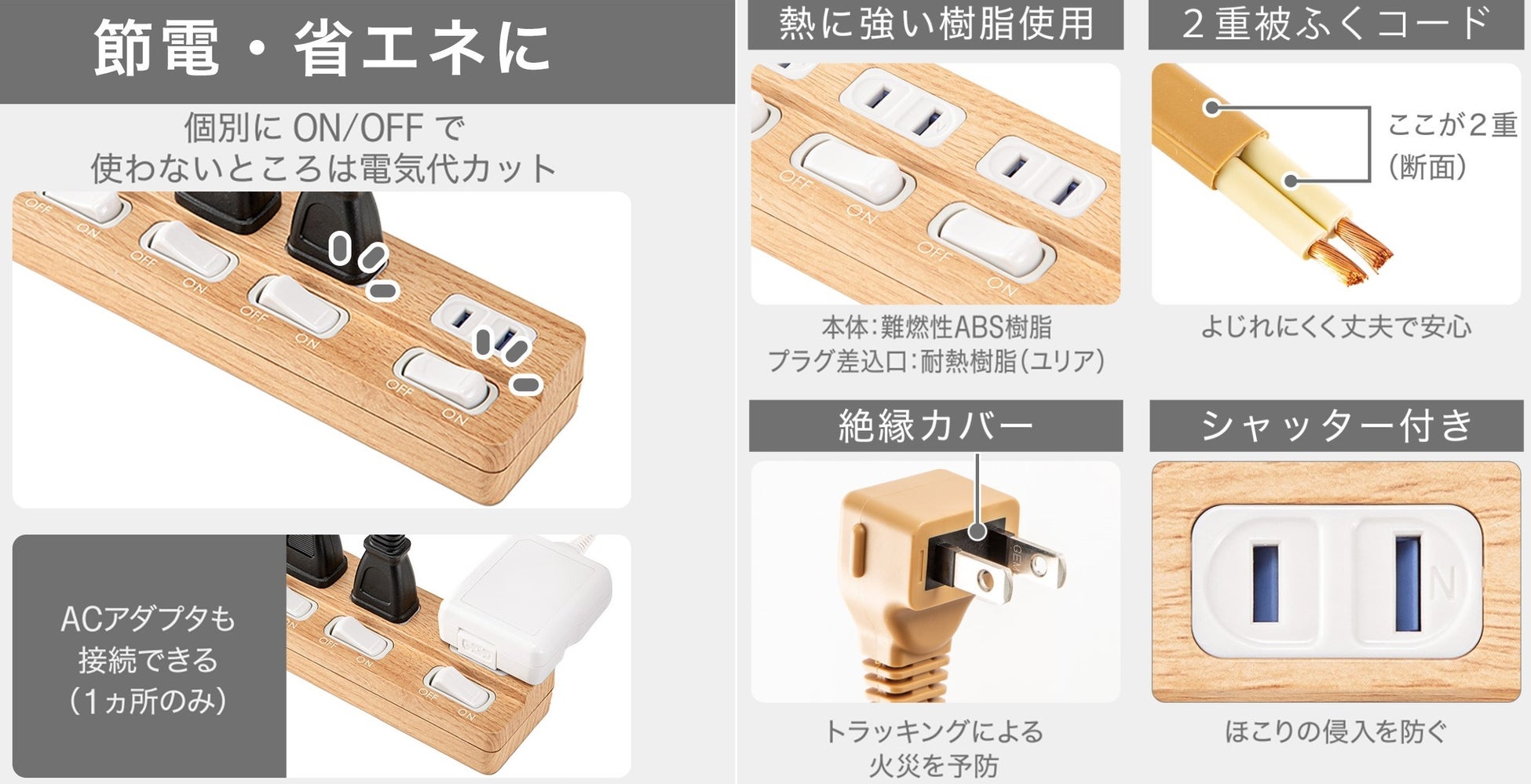 ①ON/OFFスイッチが個別についており、使わない電化製品の待機電力をカットできます。