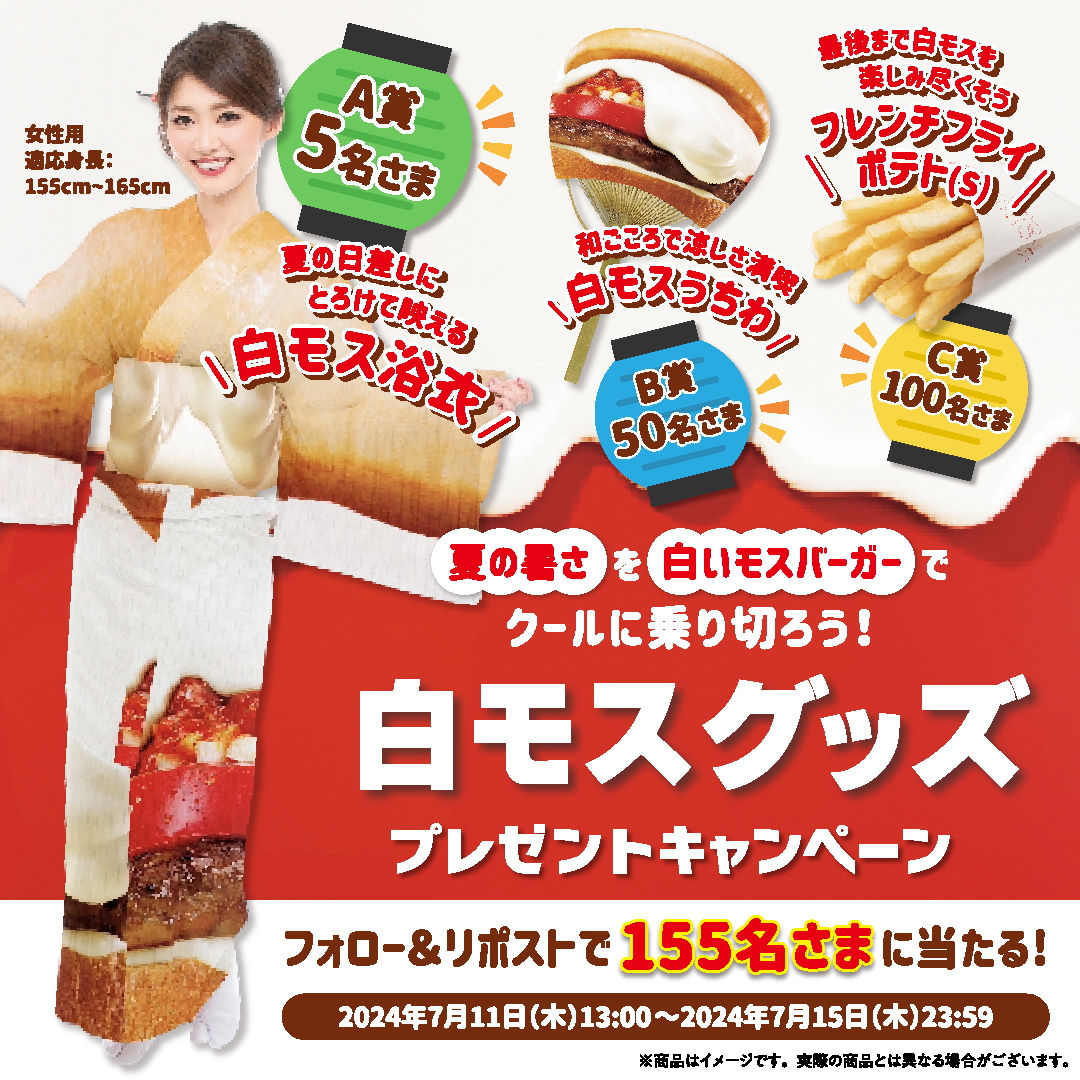 キャンペーンでは、以下の応募条件を満たしてエントリーいただいた方の中から、A賞として抽選で 5名様に「白モス浴衣(女性用)」、B賞として50名様に「白モスうちわ」をプレゼントします。また、今回の白いモスバーガーがチーズソースを昨年よりも4割増やしていることにちなみ、ポテトをチーズソースにつけることで最後までおいしく食べられるよう、C賞として抽選で100名様にお店で引き換えられる「フレンチフライポテト Sサイズ」の無料クーポンをプレゼントいたします。