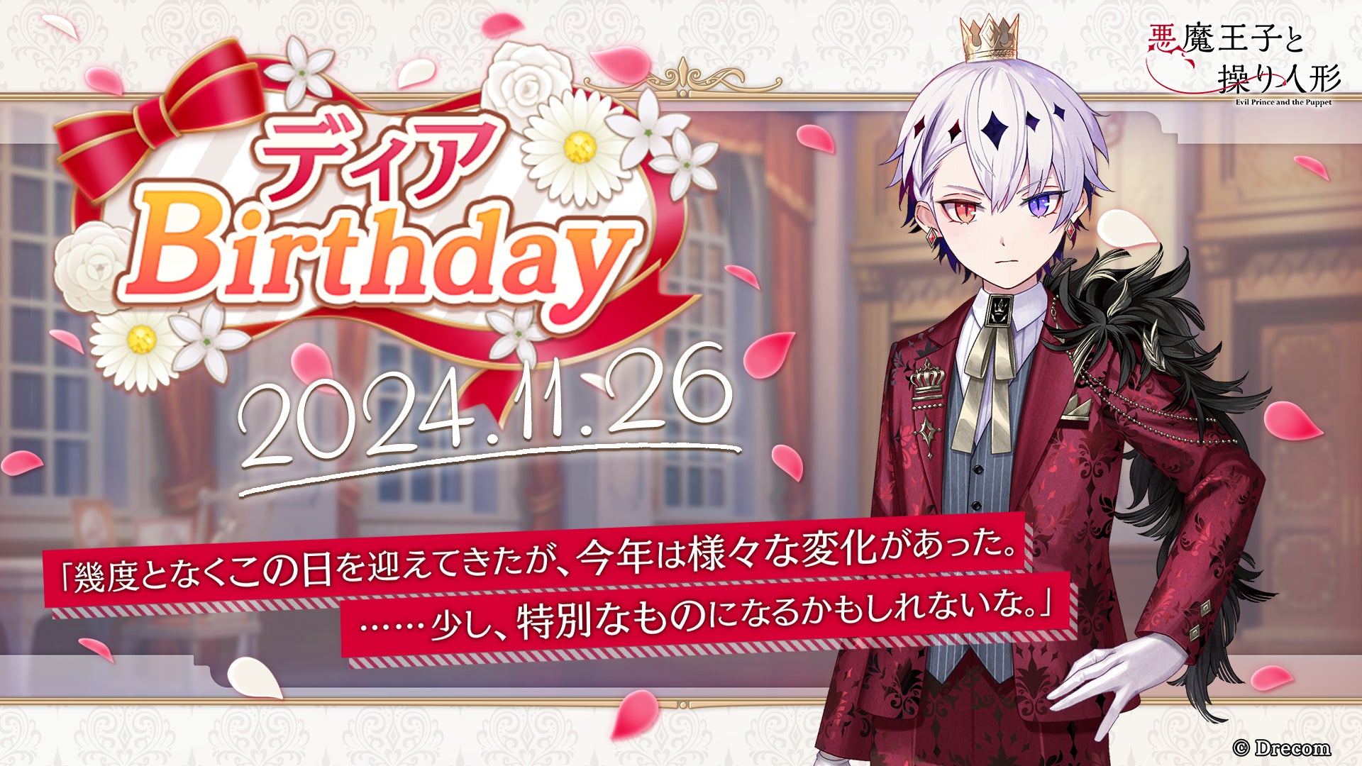 株式会社ドリコム(本社:東京都品川区、代表取締役社長:内藤裕紀、以下ドリコム)は、本日2024年11月26日(火)より、弔花者と呪いを癒すダークファンタジーADV『悪魔王子と操り人形(あくあや)』にて、悪魔の王子「ディア」の誕生日(11月26日)を記念し、期間限定「ディアBirthdayキャンペーン」を開催いたします。
