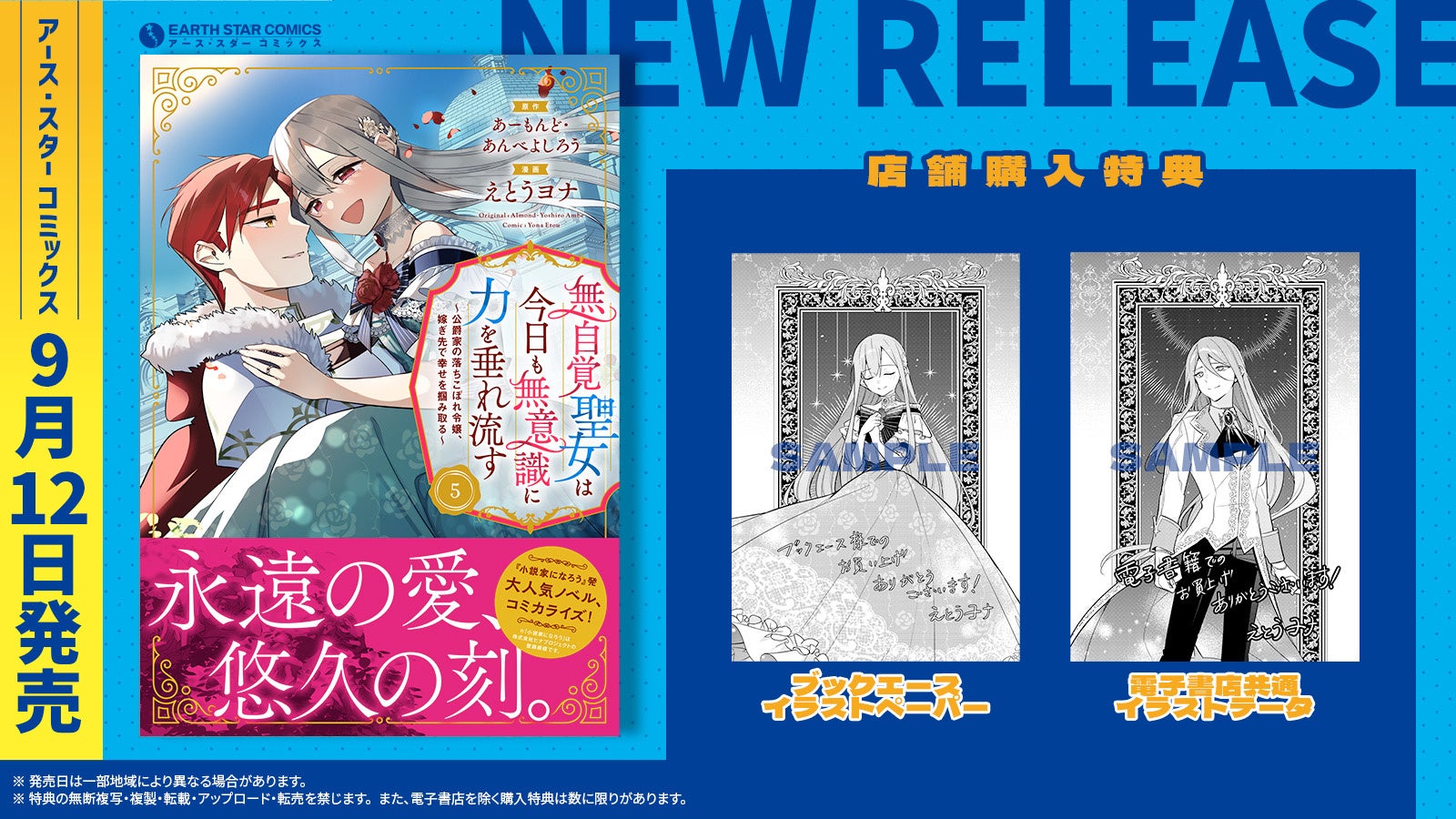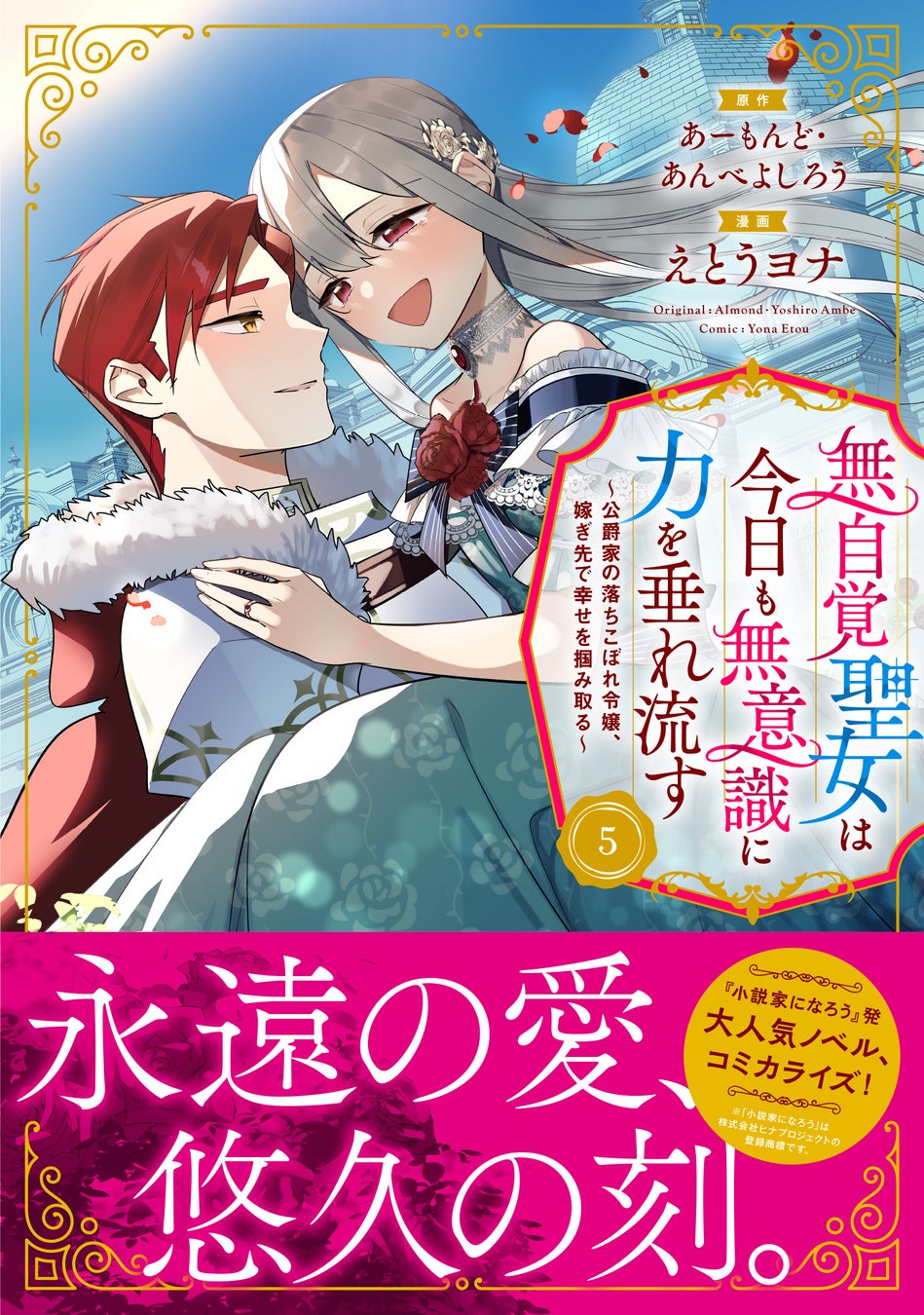 現在コミック アース・スター公式サイトにて連載中の人気作品『無自覚聖女は今日も無意識に力を垂れ流す ~公爵家の落ちこぼれ令嬢、嫁ぎ先で幸せを掴み取る~』第5巻(原作:あーもんど・あんべよしろう 漫画:えとうヨナ)を9月12日(木)に発売いたします。