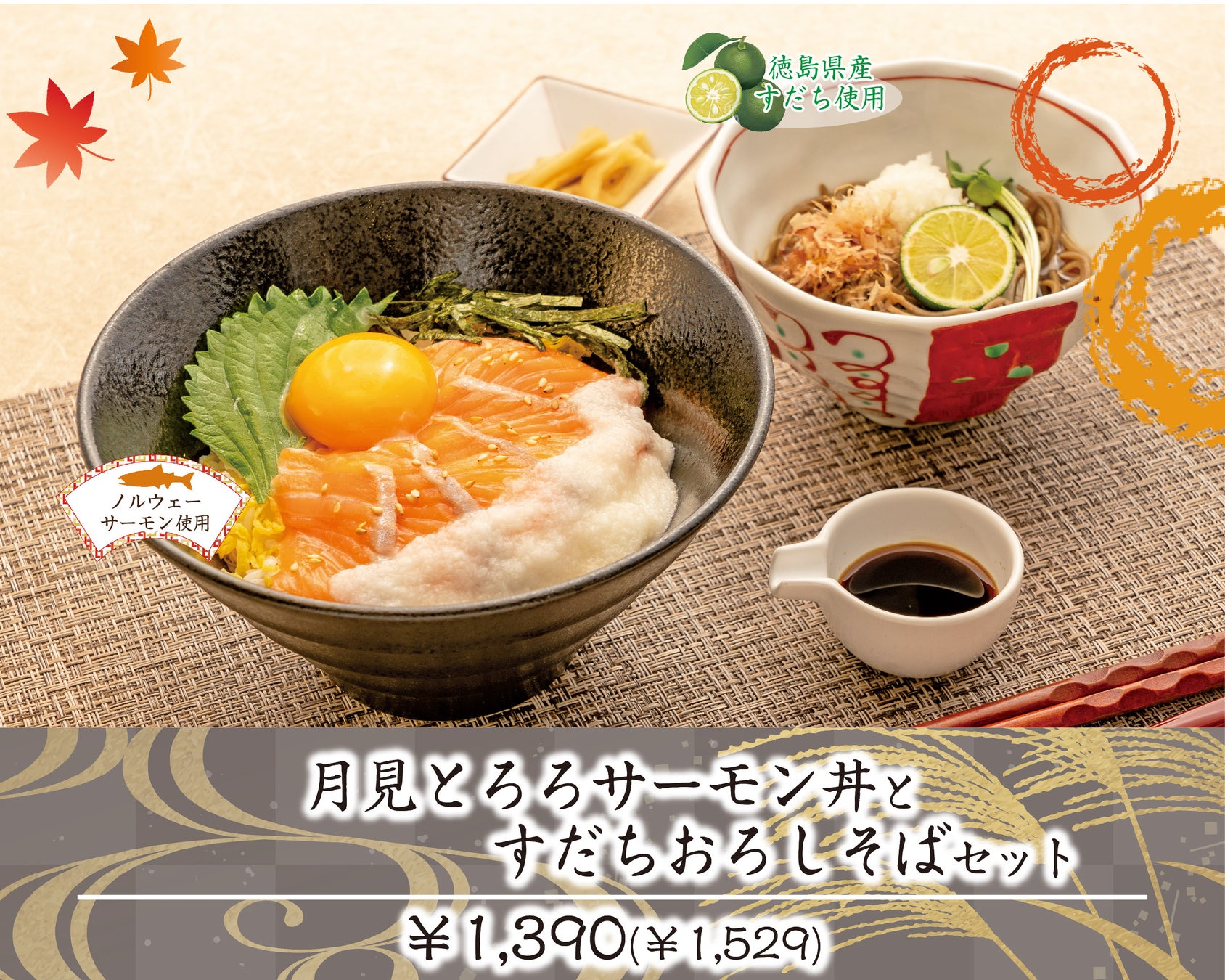秋が旬のサーモンに名物玉子焼(明石焼)、すだちの香りと酸味が食欲をそそるすだちおろしそば、サーモン丼には卵黄をトッピングし、特製海鮮醤油でお召し上がりください。
