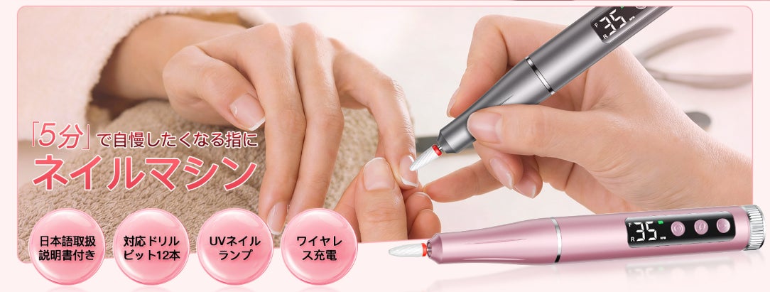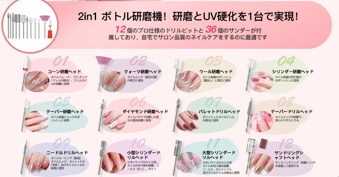 4. 届いたその日から使える充実のアクセサリー セラミックビットやサンディングバンドなど、用途に合わせた豊富なアタッチメントを同梱。甘皮ケアから角質除去、爪の整形まで多用途に対応します。