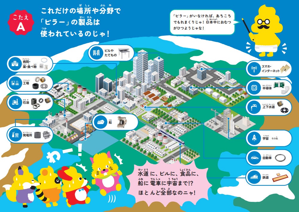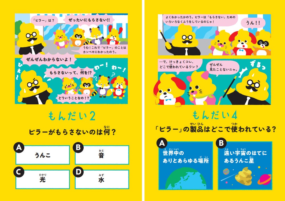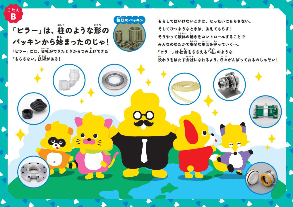 うんこねこたちが社会見学をするストーリ―に沿って出題されるクイズは選択式で全5問。PILLARが“水などの流体をもらさない会社”であることや、どんな製品を作っていてどんな場所で使われているかなどを「うんこ」というキーワードやイラストを使ってわかりやすく説明することで、クスッと笑いながら楽しんで学べるようになっています。