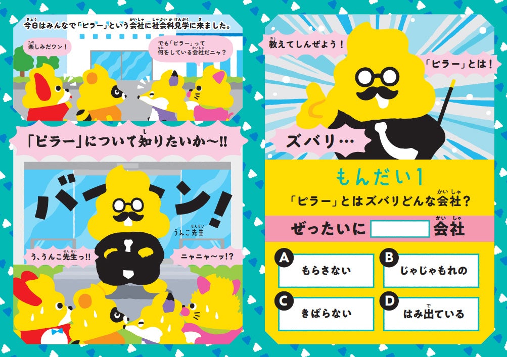 冊子では、PILLARに社会見学にきたうんこねこたちのところに突如現れたうんこ先生が、PILLARの社内広報としてクイズを出題する場面からはじまります。