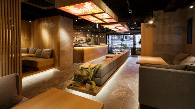 店内は、和の趣を感じさせながらもモダンで洗練されたデザインが施されており、ゆったりとしたソファ席やテーブル席が配置されています。落ち着いた色調と自然素材を活かしたインテリアが、心安らぐひとときを演出し、訪れる方々に穏やかな時間を提供いたします。