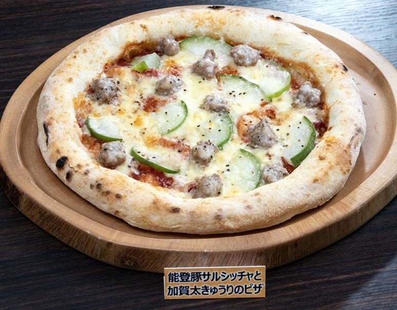 「能登豚のサルシッチャと加賀太きゅうりのピザ」は、石川県で育った能登豚のサルシッチャと、加賀地方を代表する伝統野菜の加賀太きゅうりがトッピングのピザです。