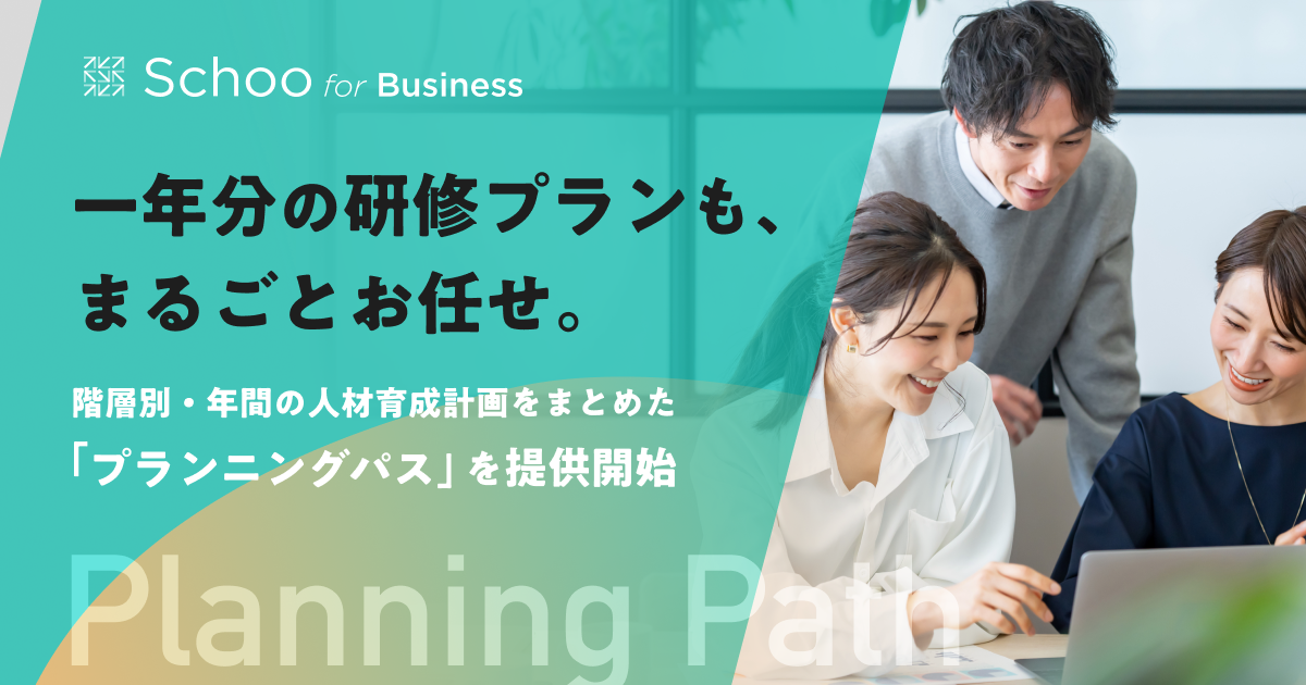 インターネットでの学びや教育を起点とした社会変革を行う株式会社Schoo(本社:東京都渋谷区、代表取締役社長CEO:森 健志郎、以下「スクー」)は、法人向けeラーニングサービス「Schoo for Business」において、多忙な人事担当者でも階層別の年間育成計画をスムーズに運用できる新パッケージ「プランニングパス」の提供を開始しました。
