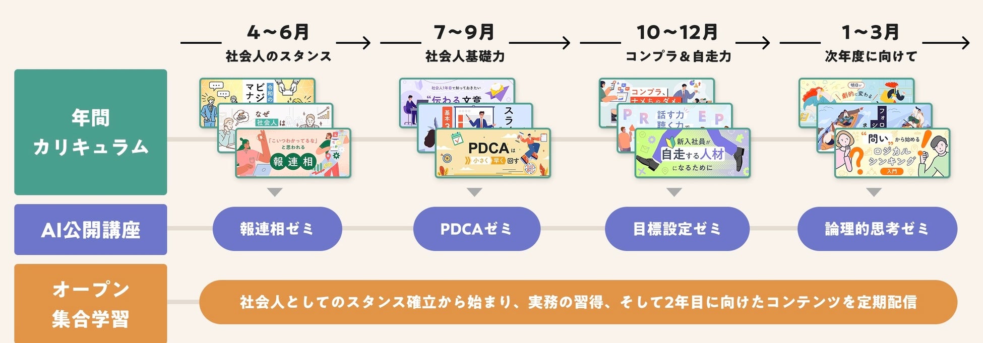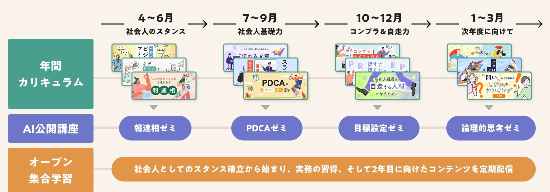 単なるおすすめ授業の羅列ではなく、140万人の学習ログをもとに、実際の受講傾向や活用実績を踏まえて授業を選定し、3か月単位の通年計画としてパッケージ化しました。人事担当者は、自社の対象階層に合ったモデルを選ぶだけで運用を開始できます。人材開発に十分な時間を割きにくい中でも、月3時間程度の運用で年単位の育成計画を進めやすい設計です。