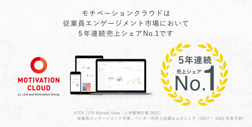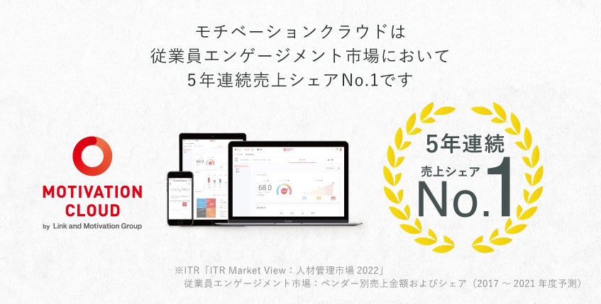 株式会社リンクアンドモチベーション(本社:東京都中央区、代表:小笹芳央、証券コード:2170 以下、当社)は、株式会社アイ・ティ・アール(以下、ITR)が発行する市場調査レポート「ITR Market View:人材管理市場2022」の、従業員エンゲージメント市場のベンダー別売上金額シェアにおいて、5年連続で第1位(2017~2021年度予測)を獲得したことを、下記の通りお知らせいたします。