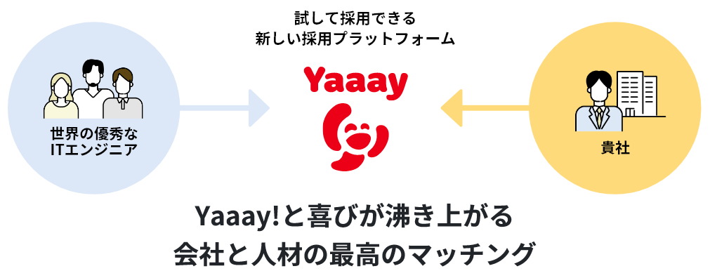 「Yaaay(イェーーイ)」は、企業が格安の固定費(月5万円)のみで日本国内も含む世界中の優秀なITエンジニアを採用することができるサービスです。固定料金で採用し放題な上、採用前に実際に共に働いてみる「トライアルワーク」でミスマッチ(短期離職)のリスクを最大限回避できることが特徴です。