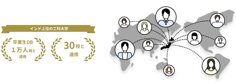 世界中に存在する日本で働きたい莫大な数の外国人エンジニアからベストな人材を採用できるよう、全研本社が保有しているインドの上位大学卒業生1万人超のDBと連携に加え、世界中のネットワークを駆使して世界最大の質と量の人材DBを目指します。