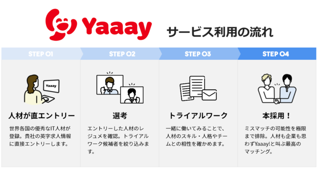 試してから採用という新しい採用スキームを取り入れたITエンジニアリクルーティングのプラットフォーム「Yaaay(イェーーイ)」は、企業の理念や事業情報を正しく人材に発信する英字求人メディアでもあります。本サービスはエンジニア不足に悩む中小・ベンチャー企業が、自社にマッチしたスキル・人柄のエンジニアを採用することを可能にします。