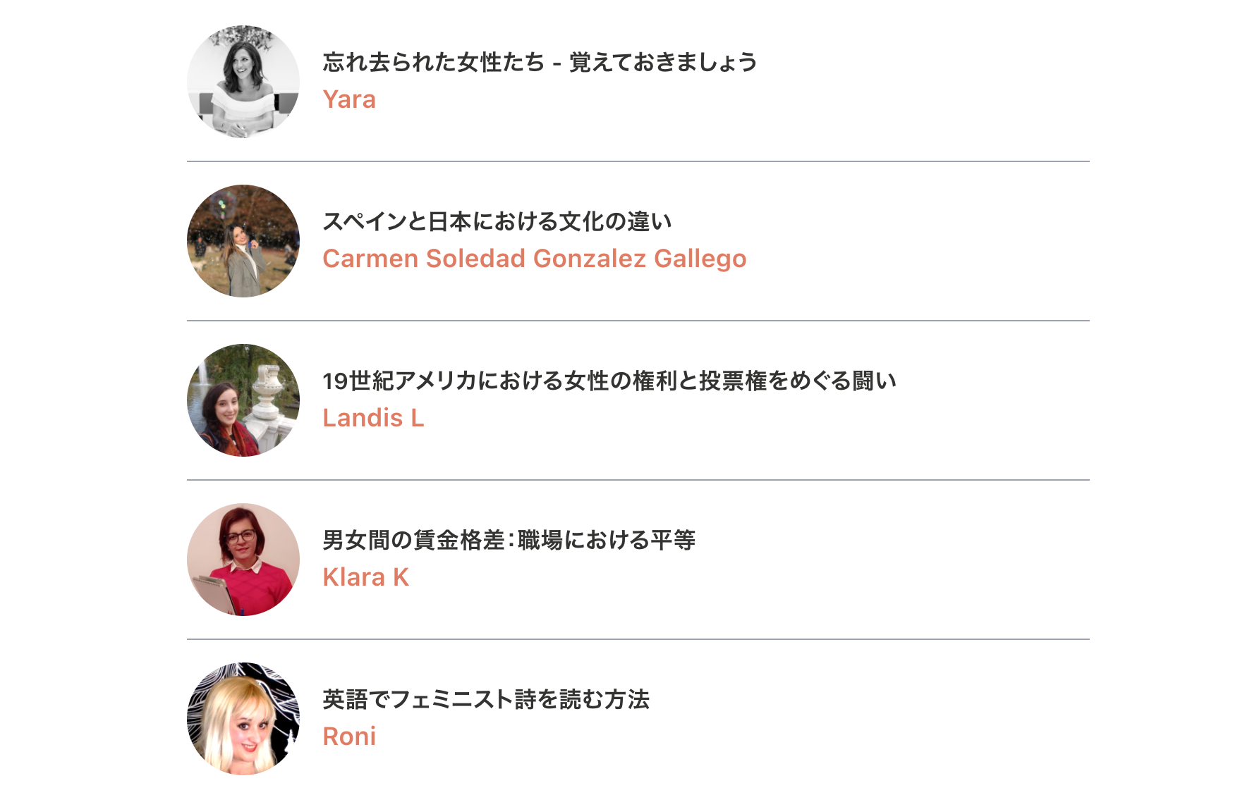3月8日(火)の国際女性デーを記念し、カフェトークでは、歴史上における女性の重要人物、女性の権利運動、フェミニズム、ジェンダー平等について学び、フェミニニティの様々な側面を探求していく機会を、カフェトーク講師が提供するカテゴリー別の様々なレッスンを通してご紹介しています。