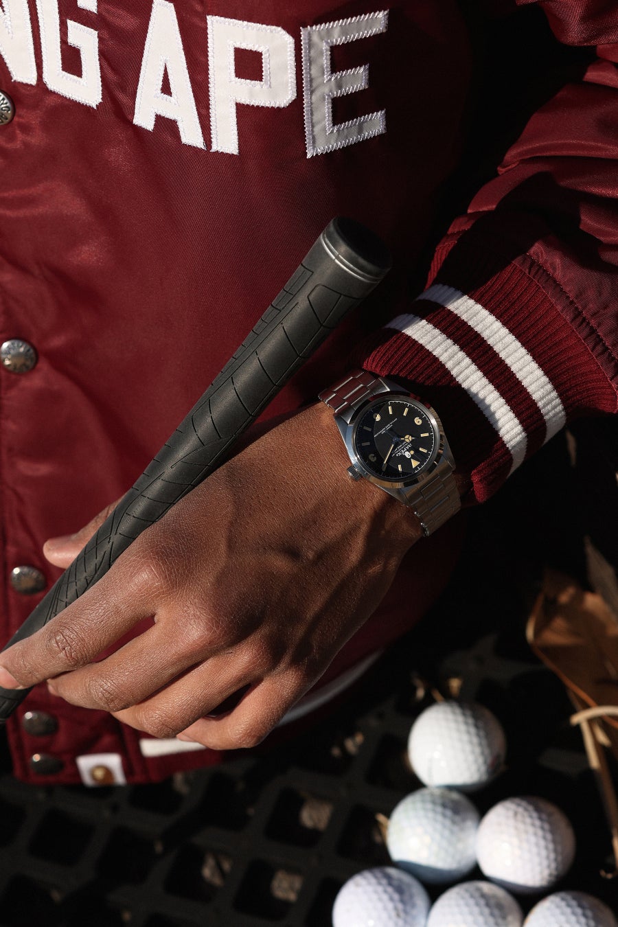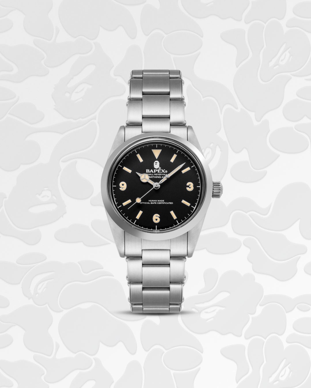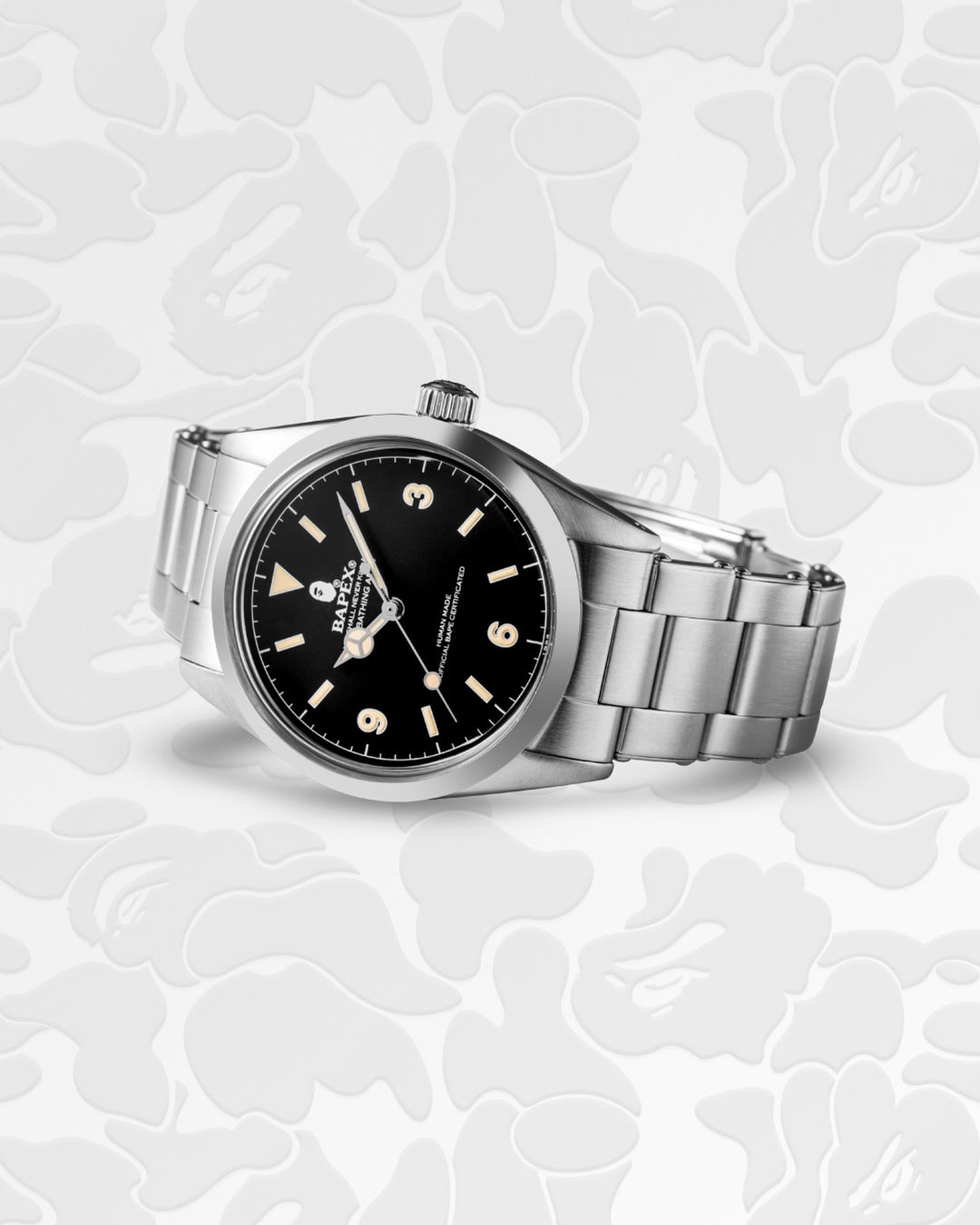 その輝きは、まるで白と見間違えるほどの超軽量シルバーで、ベゼルとケースもステンレススチールを使用しており、ブラックの時計の文字盤は丈夫なグラスファイバーで保護されています。他のBAPEX®と同様、100M防水、40時間以上のパワーリザーブ、ルミナスディスプレイ、永久機械式自動巻きムーブメントなど、耐久性と実用性を兼ね備えています。どのようなスタイルにもフィットし、かつ、あなたのコーディネートの中で最も注目されるアクセサリーとなるでしょう。