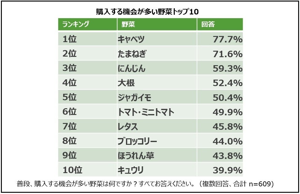 普段購入する機会が多い野菜について質問したところ、キャベツが1位(77.7%)となり、たまねぎ(71.6%)、にんじん(59.3%)、大根(52.4%)といった日持ちしやすい野菜が上位に挙げられる一方、7位のレタス(45.8%)、9位のほうれん草(43.8%)といった、傷みの早い葉物類も多く購入されていることがわかりました。