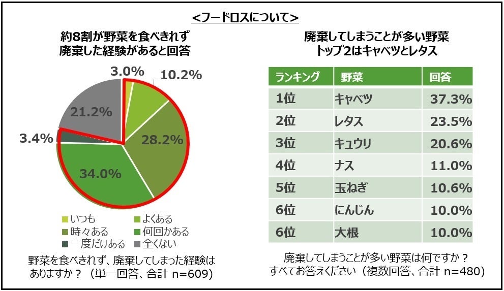 野菜摂取への意識が高まる一方で、野菜を食べきれず廃棄してしまった経験がある人は8割もいる実態が明らかになりました。普段購入する機会の多いキャベツやレタスは、「傷みやすいため保存方法に困ることが多い」「廃棄してしまうことが多い」上位2位を占め、お困り野菜である実態も明らかになりました。