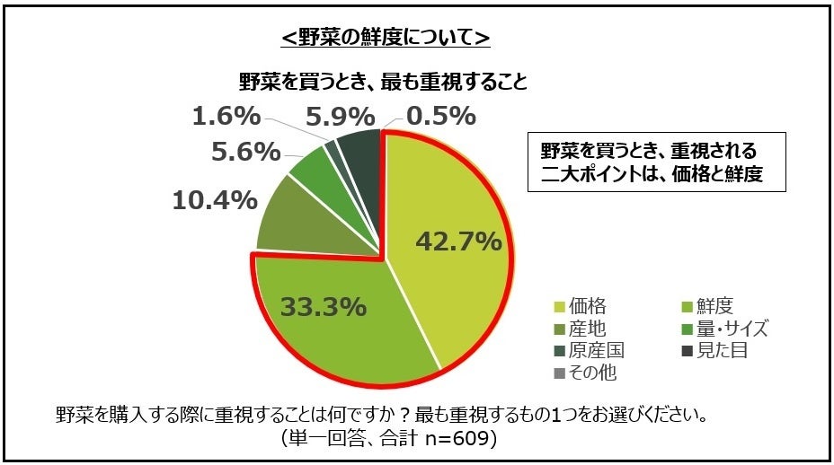 野菜を購入する際に最も重視するポイントを質問したところ、「価格」と回答した人は42.7%、「鮮度」と回答した人は33.3%と、「価格」と「鮮度」の回答が全体の8割近くを占めることがわかりました。