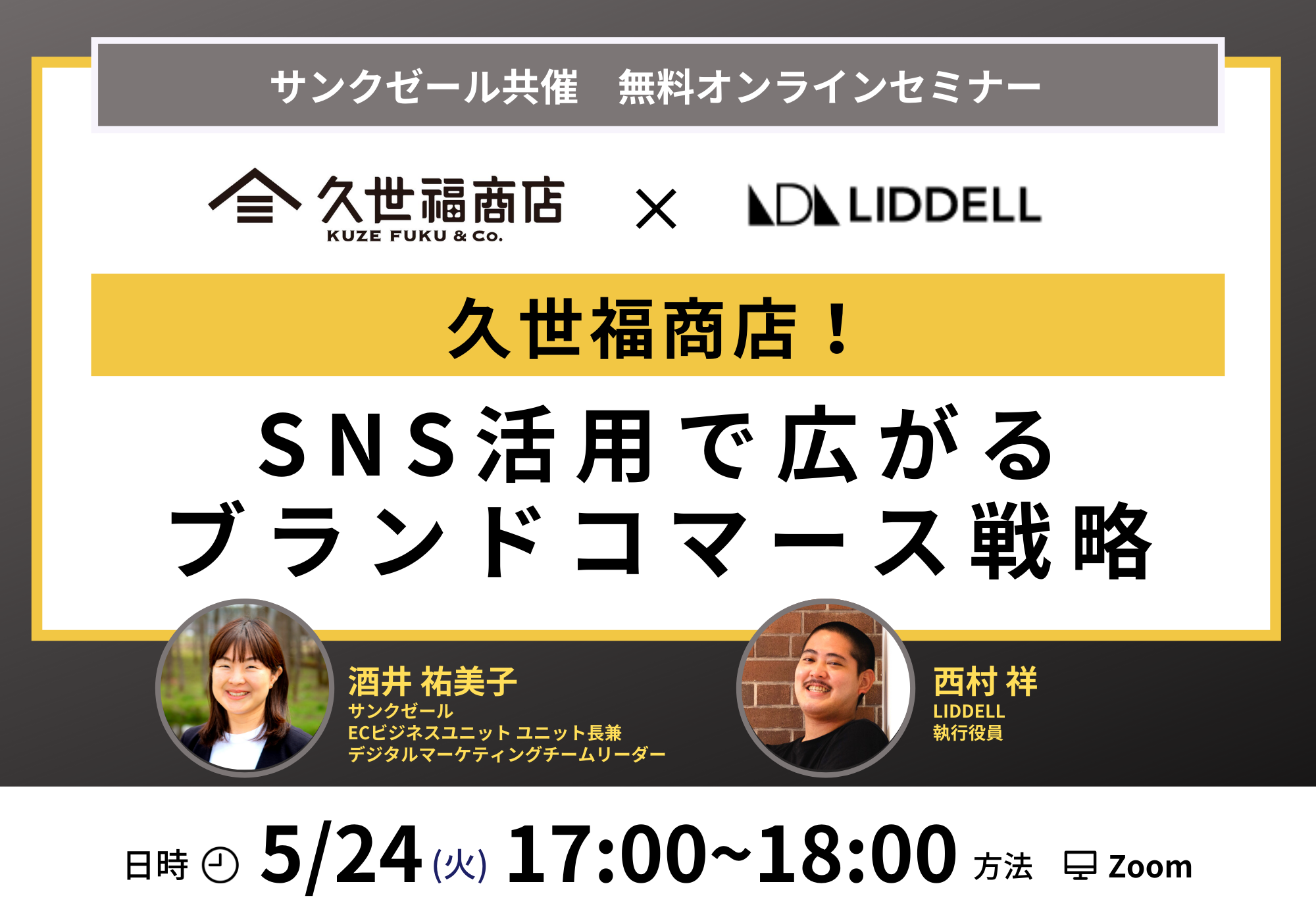 インフルエンサーマーケティング事業を展開するLIDDELL株式会社 (本社:東京都港区、代表取締役:福田 晃一、以下リデル) は、久世福商店を展開する株式会社サンクゼール(本社:長野県飯綱町、代表取締役社長:久世 良太、以下サンクゼール)と共同で、「SNS活用で広がるブランドコマース戦略」と題した、無料オンラインセミナーを、2022年5月24日(火)17:00~18:00に開催致します。