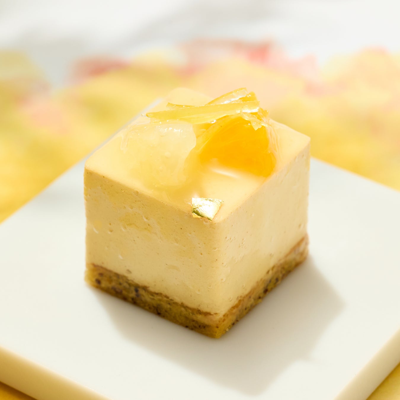 グレープフルーツとオレンジを使用したケーキ。グレープフルーツのコクのあるクリームに、カモミールで香りづけしたブラッドオレンジのジュレをあわせ、柑橘の香りと苦みを表現しました。ホワイトチョコレートと紅茶のムースをあわせることでまろやかさを出し、苦みのバランスをとっています。春から初夏のあたたかくてまぶしい太陽の光をイメージして作りました。