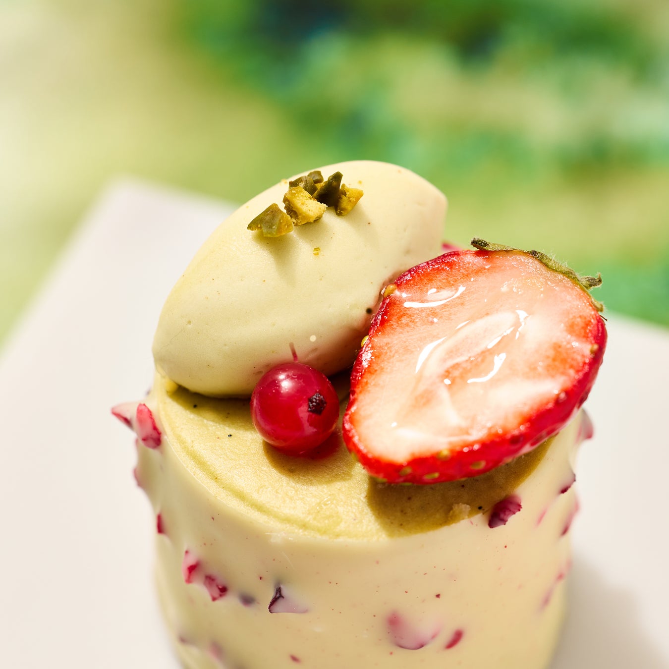 苺のみずみずしさをジュレで表し、ピスタチオの濃厚なクリームを合わせました。天面のピスタチオのシャンティが濃厚さをプラスし、贅沢な味わいになっています。春のうららに食べていただきたいそんな一品です。