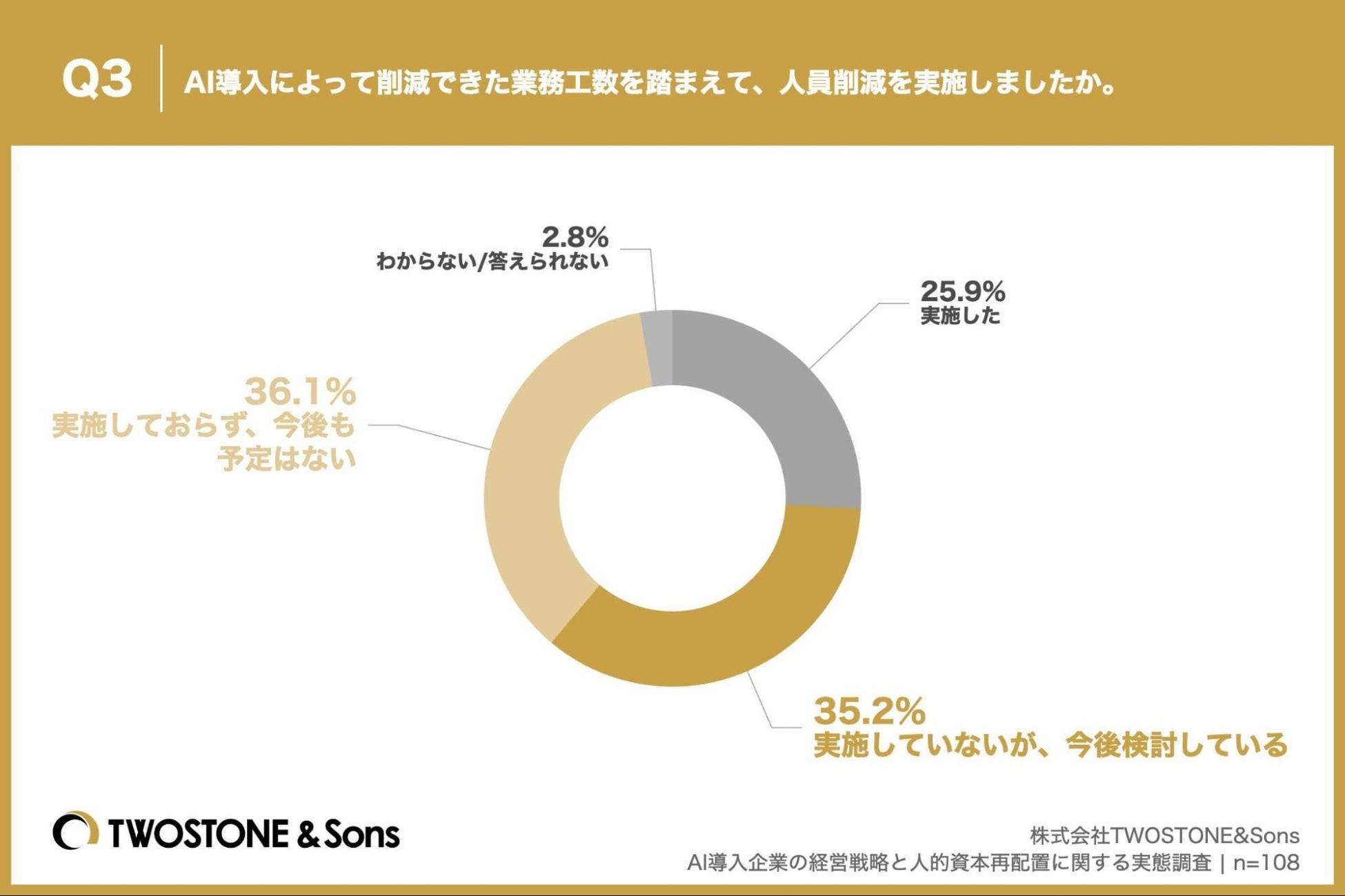 「Q3. AI導入によって削減できた業務工数を踏まえて、人員削減を実施しましたか。」(n=108)と質問したところ、「実施しておらず、今後も予定はない」が36.1%、「実施していないが、今後検討している」が35.2%という回答となりました。