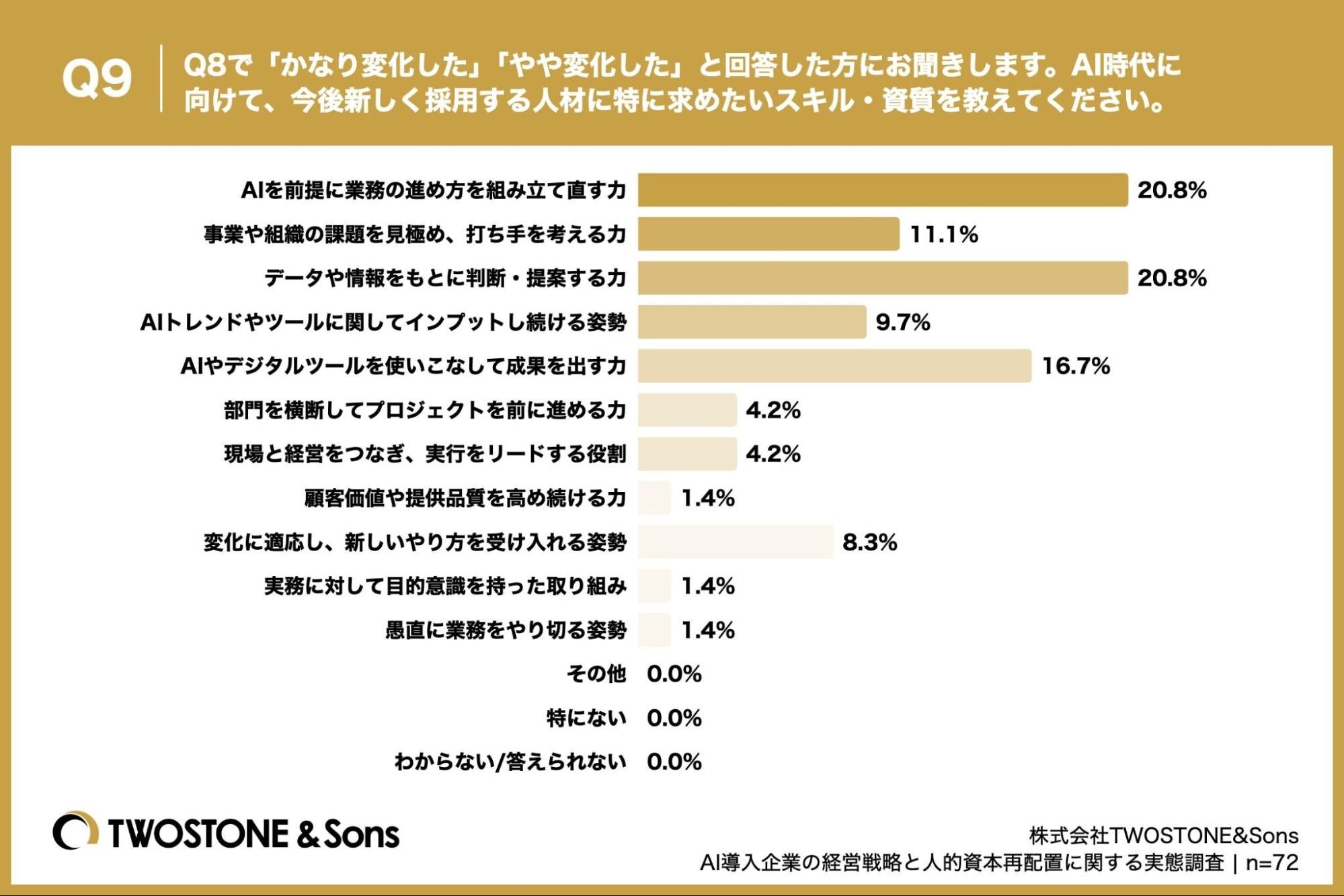 「Q9. Q8で「かなり変化した」「やや変化した」と回答した方にお聞きします。AI時代に向けて、今後新しく採用する人材に特に求めたいスキル・資質を教えてください。」(n=72)と質問したところ、「AIを前提に業務の進め方を組み立て直す力」が20.8%、「AIやデジタルツールを使いこなして成果を出す力」が20.8%という回答となりました。