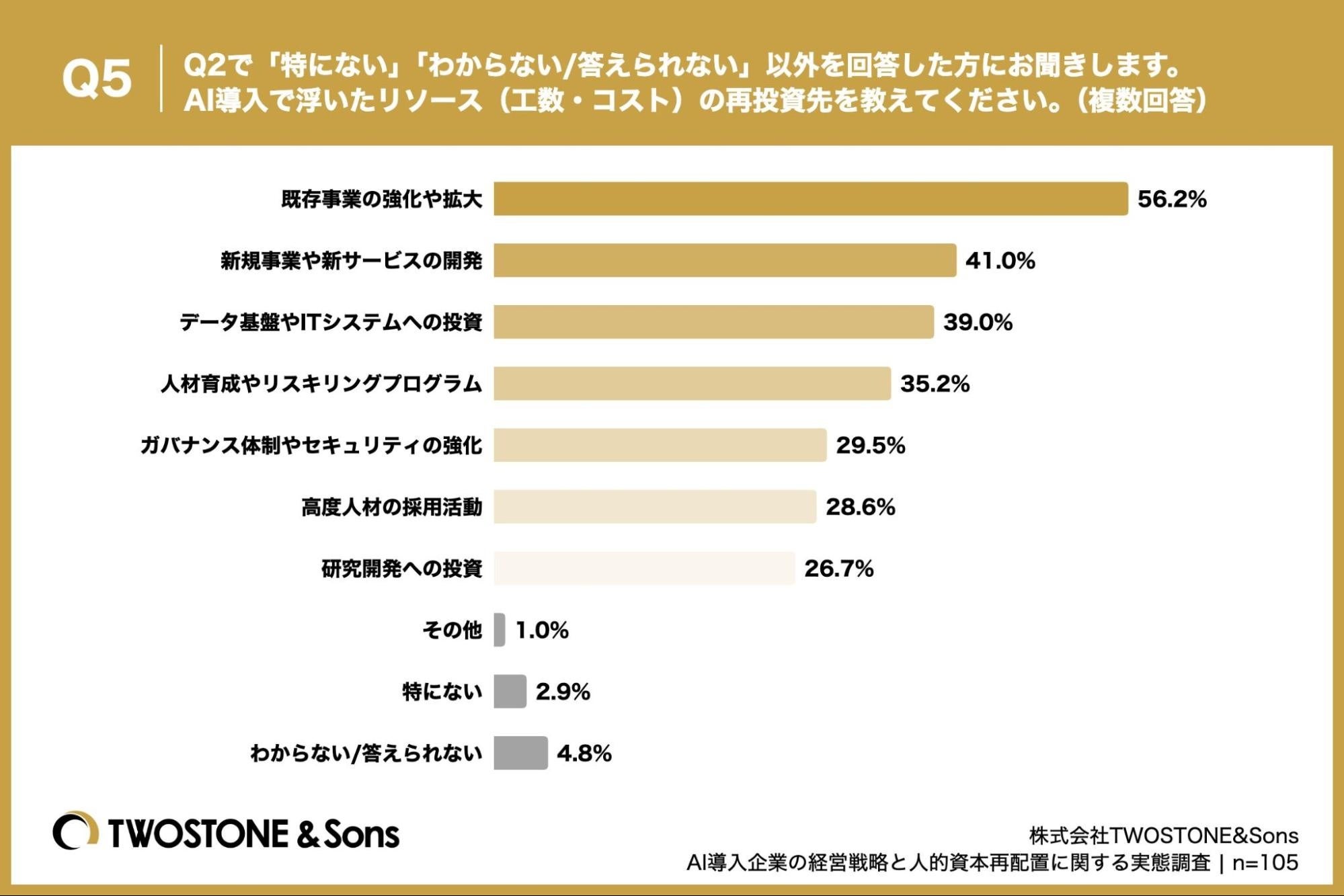 「Q5. Q2で「特にない」「わからない/答えられない」以外を回答した方にお聞きします。AI導入で浮いたリソース(工数・コスト)の再投資先を教えてください。(複数回答)」(n=105)と質問したところ、「既存事業の強化や拡大」が56.2%、「新規事業や新サービスの開発」が41.0%、「データ基盤やITシステムへの投資」が39.0%という回答となりました。