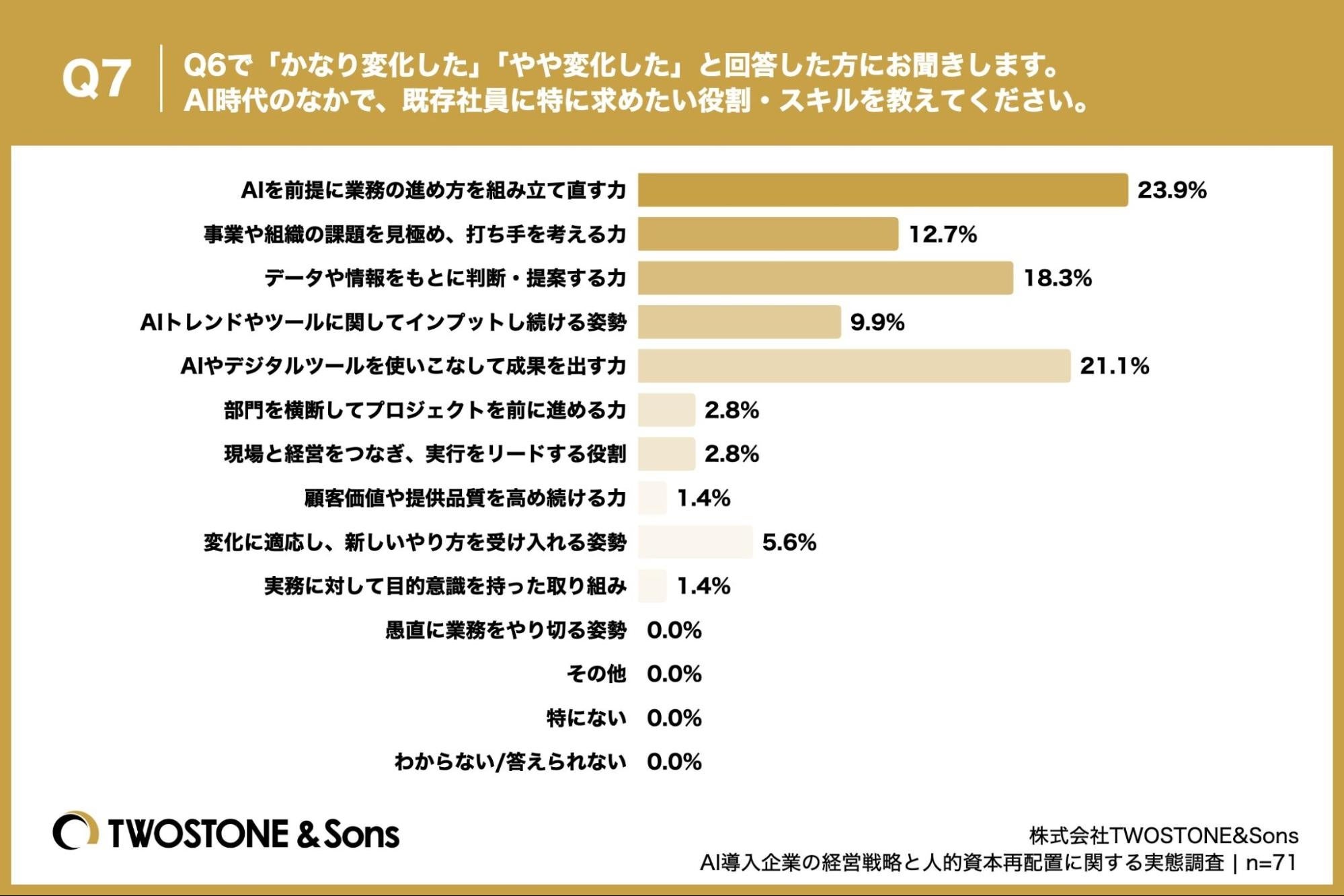 「Q7. Q6で「かなり変化した」「やや変化した」と回答した方にお聞きします。AI時代のなかで、既存社員に特に求めたい役割・スキルを教えてください。」(n=71)と質問したところ、「AIを前提に業務の進め方を組み立て直す力」が23.9%、「データや情報をもとに判断・提案する力」が18.3%という回答となりました。