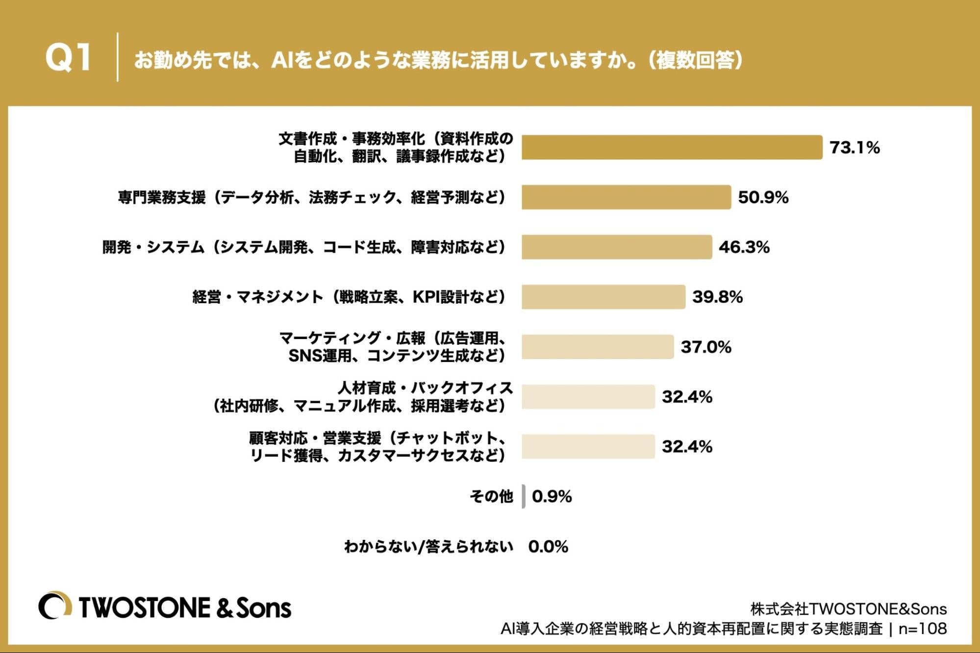 「Q1. お勤め先では、AIをどのような業務に活用していますか。(複数回答)」(n=108)と質問したところ、「文書作成・事務効率化(資料作成の自動化、翻訳、議事録作成など)」が73.1%、「専門業務支援(データ分析、法務チェック、経営予測など)」が50.9%、「開発・システム(システム開発、コード生成、障害対応など)」が46.3%という回答となりました。