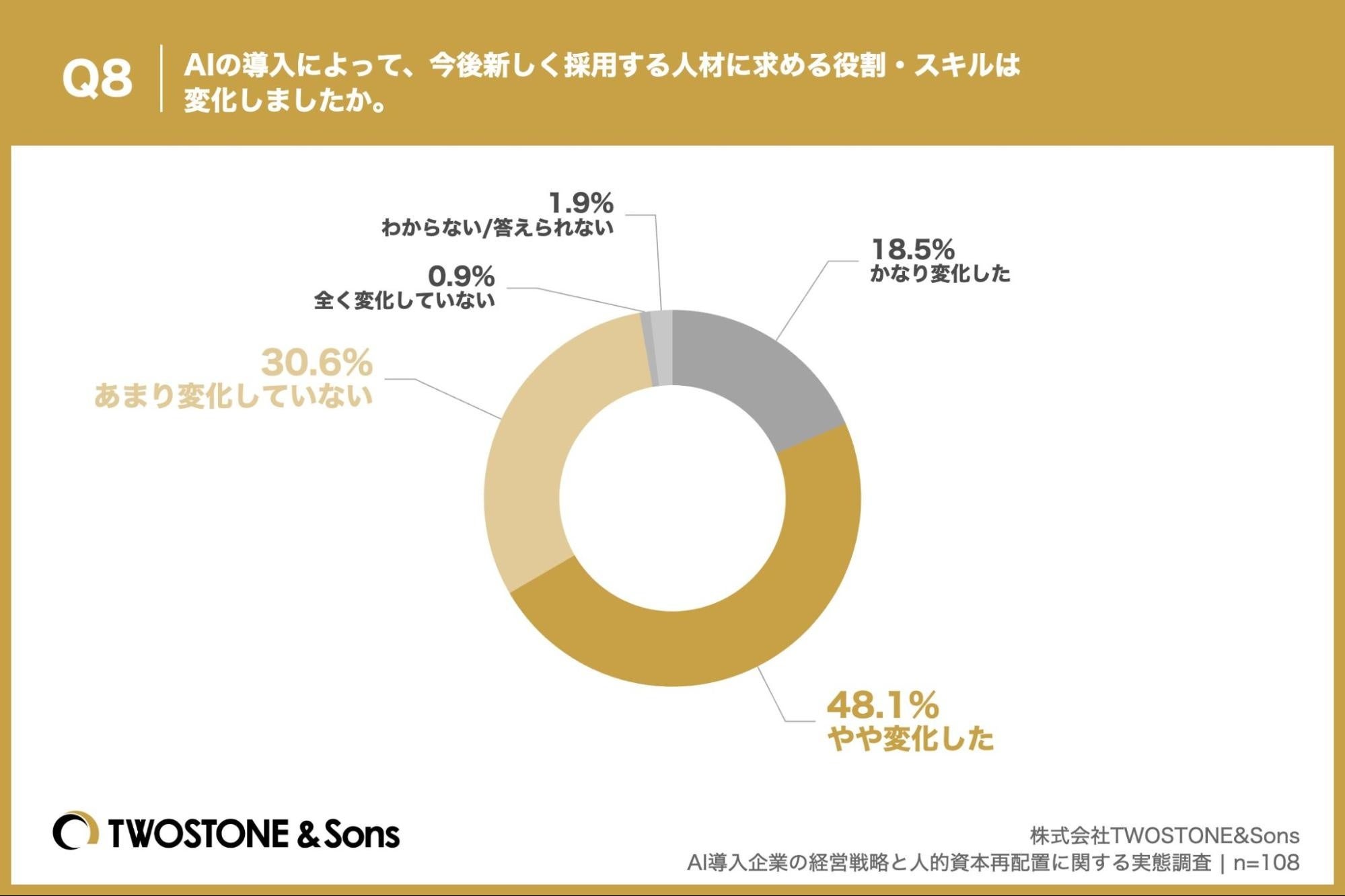 「Q8. AIの導入によって、今後新しく採用する人材に求める役割・スキルは変化しましたか。」(n=108)と質問したところ、「かなり変化した」が18.5%、「やや変化した」が48.1%という回答となりました。