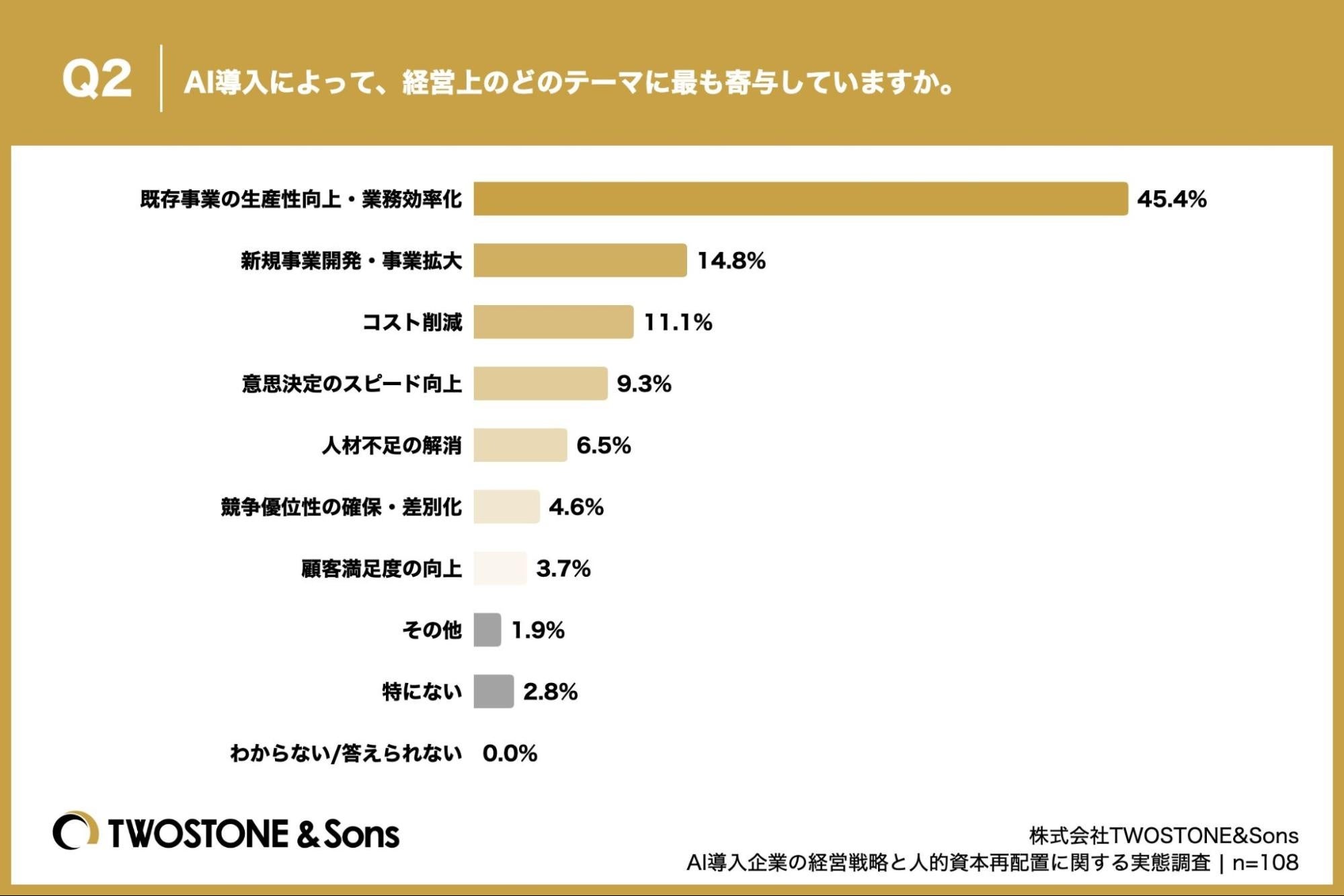 「Q2. AI導入によって、経営上のどのテーマに最も寄与していますか。」(n=108)と質問したところ、「既存事業の生産性向上・業務効率化」が45.4%、「新規事業開発・事業拡大」が14.8%という回答となりました。