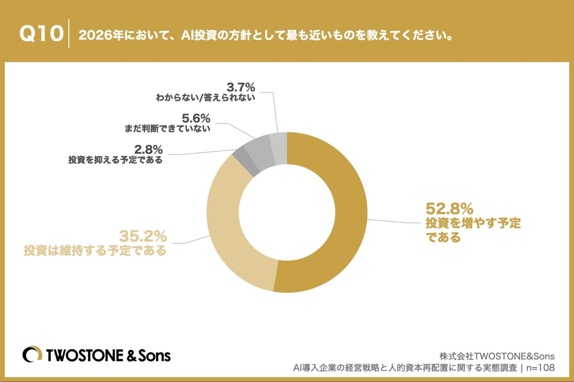 「Q10. 2026年において、AI投資の方針として最も近いものを教えてください。」(n=108)と質問したところ、「投資を増やす予定である」が52.8%、「投資は維持する予定である」が35.2%という回答となりました。